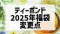 お茶 ティーポンド(TEAPOND)2025年福袋情報!変更点は? ティーポンドは、2010年に創業した日本の紅茶専門店です。旬の紅茶やフレーバードティー、紅茶に合うお菓子などを販売しています。この記事では、2025年ティーポンド福袋の販売方法や販売開始時期、024年との変更点についてまとめました。変更点ま... 2025.10.04 お茶