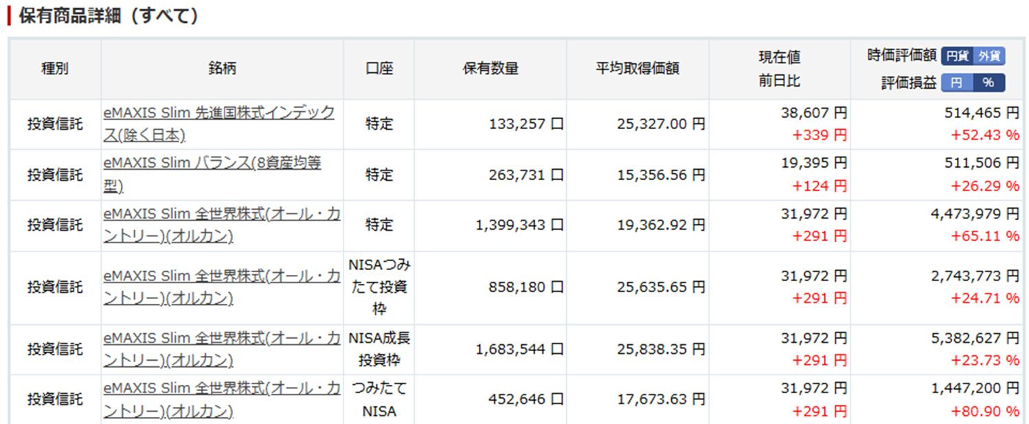 現在は新NISA分(30万/月)と特定口座(2.0万)、iDeCo(2.0万/月)を積み立てています。