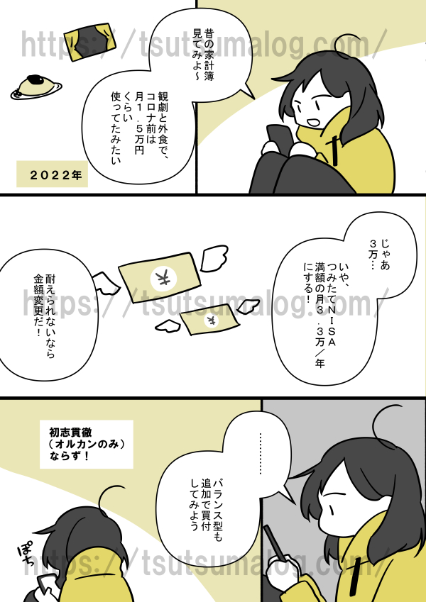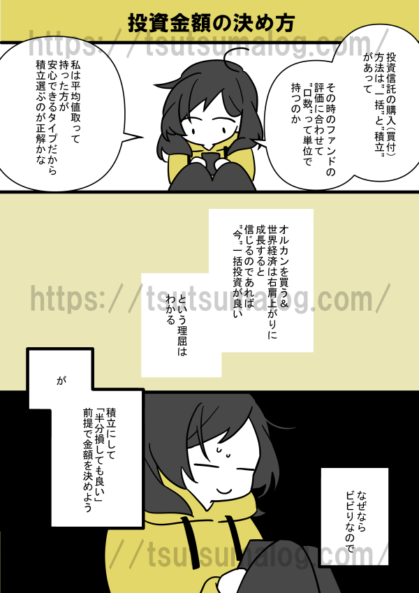 【漫画】投資金額の決め方 ※当サイトでは、アフィリエイト広告(Amazonアソシエイト含む)を利用している記事があります。 お金の話 X Facebook はてブ LINE コピー 2025.09.21 スポンサーリンク 目次 投資金額の決め方(漫画)おすすめのお金の本 投資金額の決め方(漫画) 新NISAは投資金額上限が上がった関係で、積立金額決めに悩むこともあるかと思います。つみたてNISA(2018~2023年)は、年40万円が上限だったため、金額で悩む幅が狭くてやりやすかったです。 NISA口座は楽天証券で作りました。SBI証券と楽天証券で迷った結果、楽天証券のほうが画面の操作性が自分に合っている気がして選びました。 おすすめのお金の本 DIE WITH ZERO 人生が豊かになりすぎる究極のルール [ ビル・パーキンス ] created by Rinker Kindle Amazon 楽天市場 Yahooショッピング 全面改訂 第3版 ほったらかし投資術 created by Rinker Kindle Amazon 楽天市場 Yahooショッピング JUST KEEP BUYING 自動的に富が増え続ける「お金」と「時間」の法則[ ニック・マジューリ ] created by Rinker Kindle Amazon 楽天市場 Yahooショッピング 50代から考える お金の減らし方 [ 頼藤 太希 ] created by Rinker Amazon 楽天市場 Yahooショッピング 【漫画】投資対象の選定投資対象の選定(漫画)投資対象はあまり悩まず決めました。投資を始めてから丸3年が経過しましたが、狼狽売りを考えたことは一度もありません。リスク許容度が自分に合っているようです。 (adsbygoogle = window.adsbygoog...